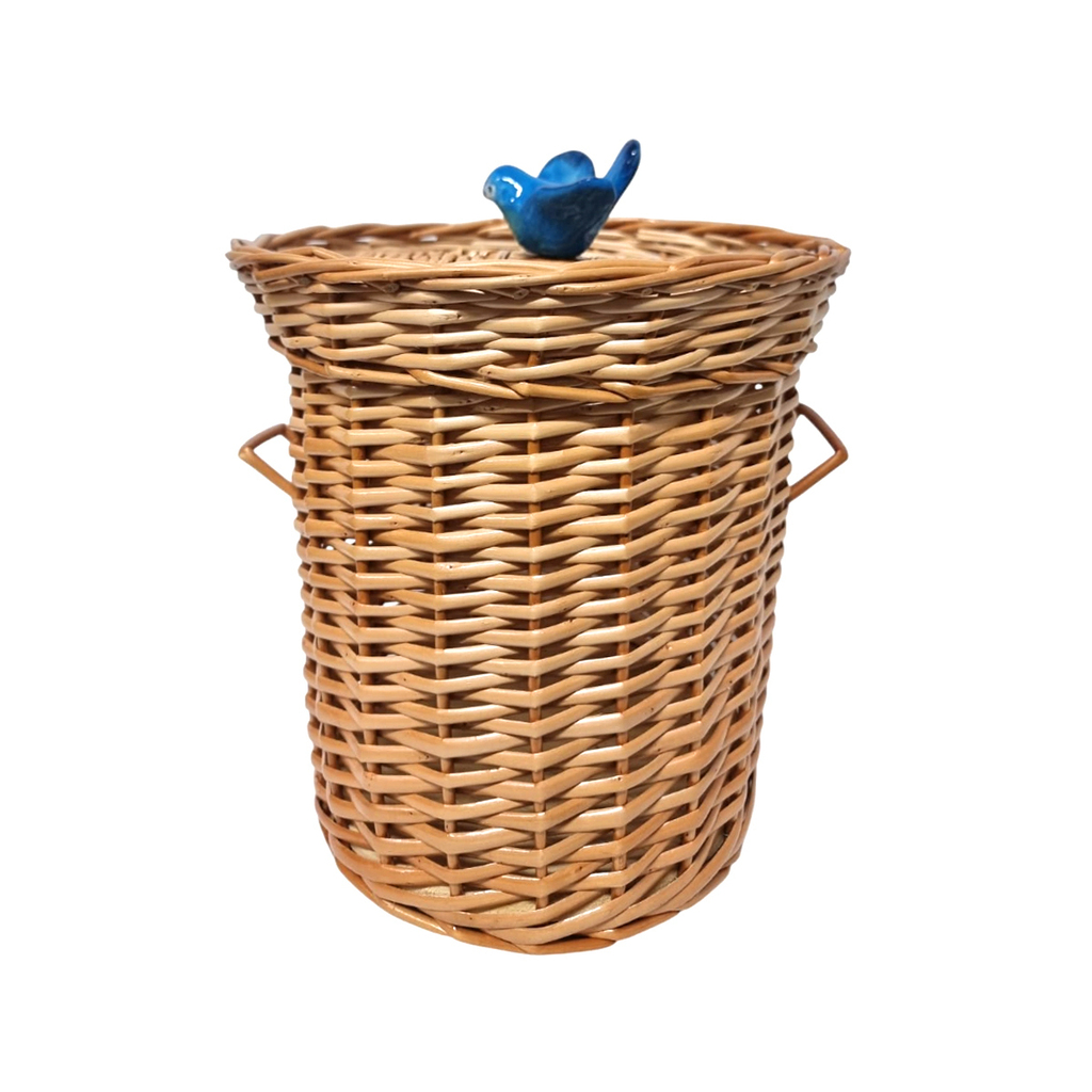 A Lixeira em Vime com Puxador em Cerâmica (Passarinho Azul) é a peça ideal para quem deseja unir decoração e funcionalidade, levando o toque acolhedor do artesanal até os menores detalhes do lar.